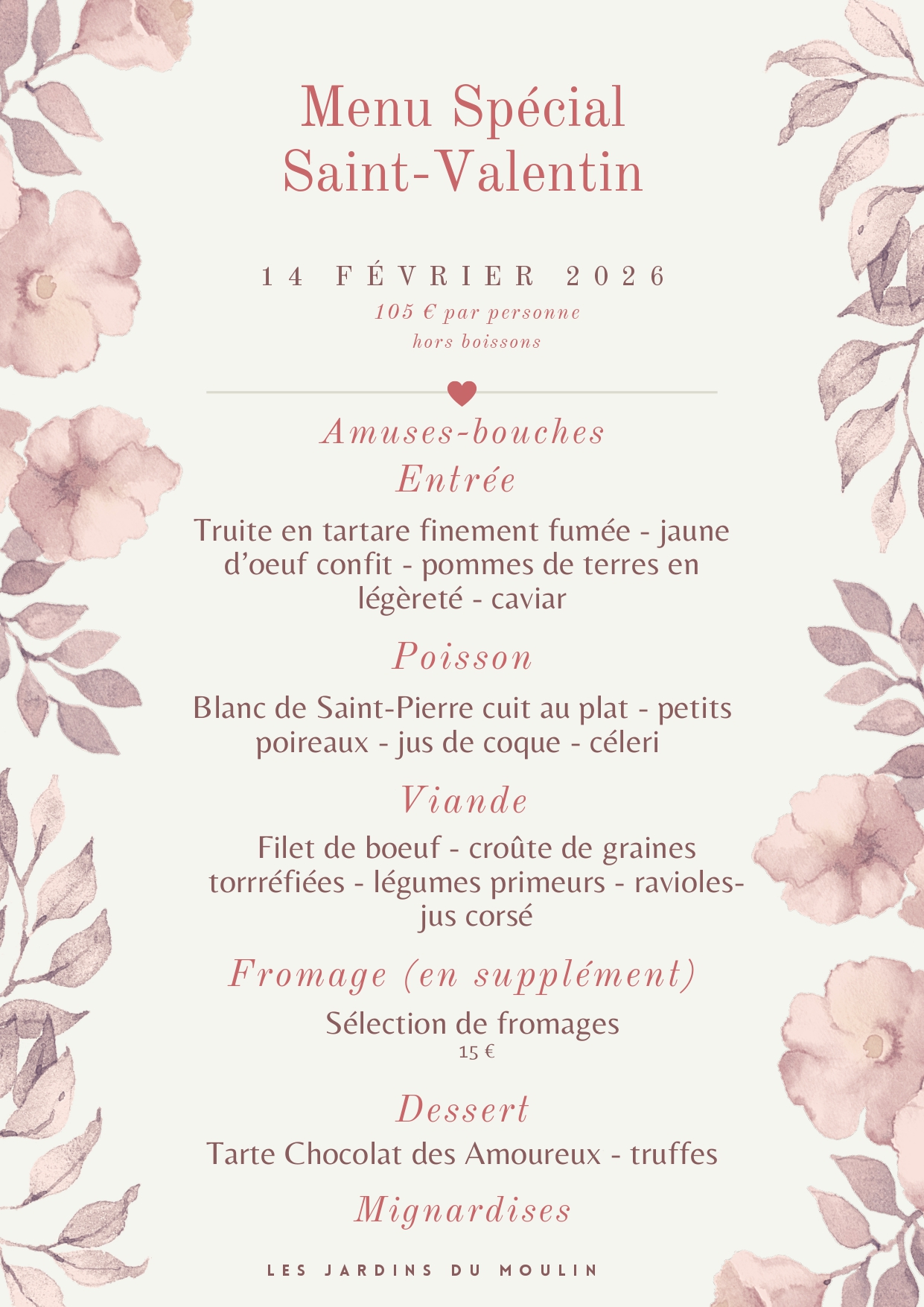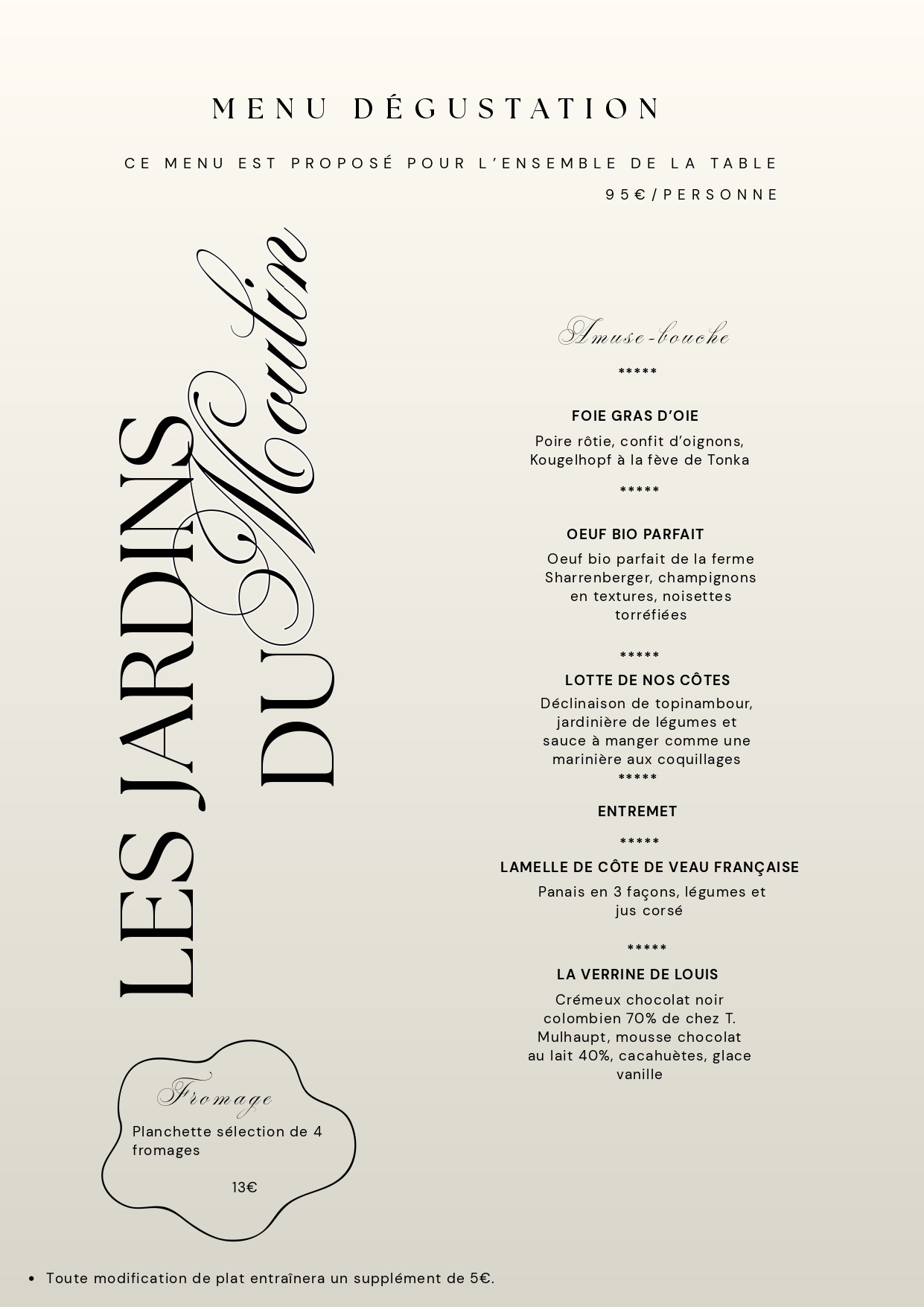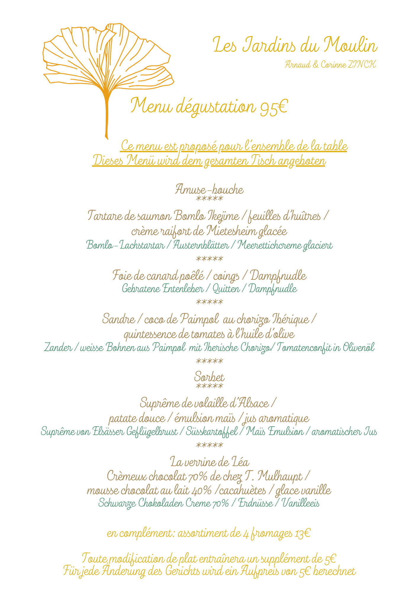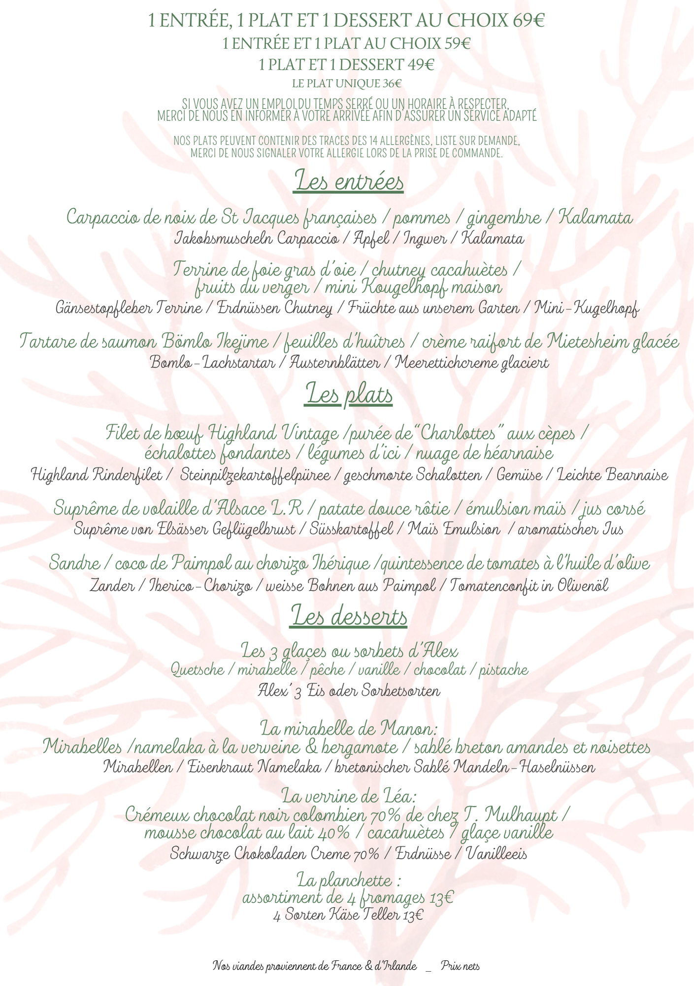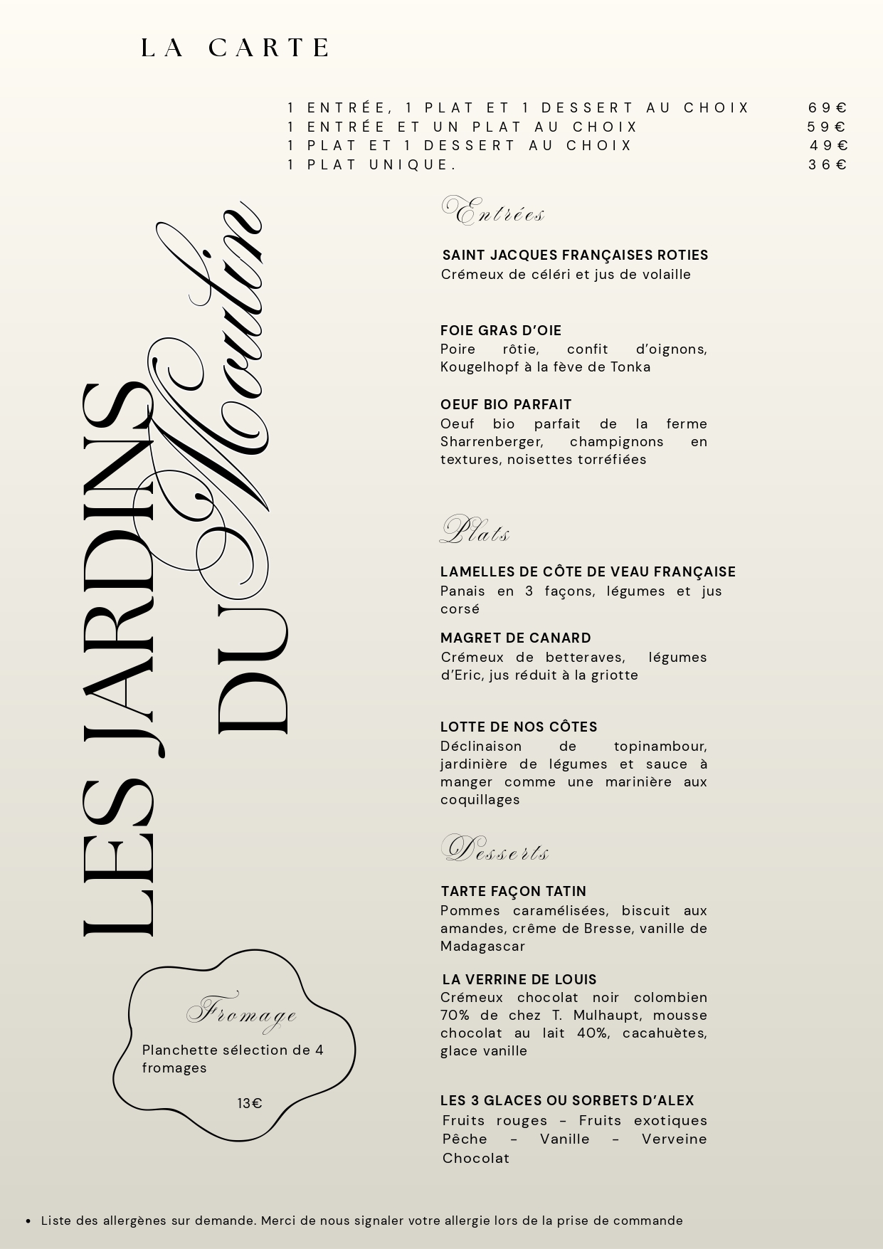 Prix nets.Pour votre information, la carte est mise à jour régulièrement, toutefois, il est possible que certains plats proposés le jour de votre réservation diffèrent de la carte en ligne, en fonction des produits de saison!